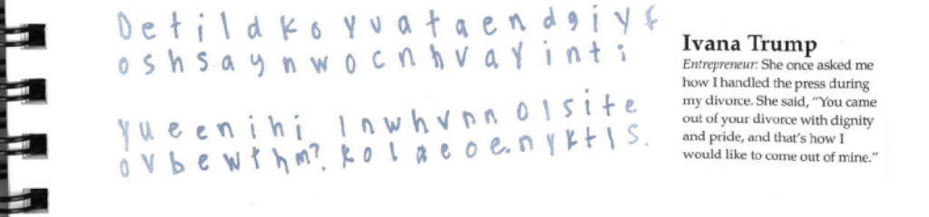 Among the vast dump of files from the U.S. Department of Justice relating to the Jeffrey Epstein investigation are many insights into the corrupt mentality of the rich and powerful, but one item upset me because it gave an insight into the psychological harm caused by Epstein’s cynical trafficking in girls and women. It’s a scrapbook, with the first page containing a birthday card for a sixteen-year-old and pages of dark messages spelt out using magazine cuttings. There are also hand-written notes, in a simple code (a two-rail “rail fence cipher“; this blog post provides a convenient decode). The notes tell a story of a girl being drawn into Epstein’s circle, apparently through Ghislaine Maxwell, and her increasing sense of being lost and abandoned by her mother. There are hints of bad encounters with named man, some identifiable such as Leon Black, former head of a big hedge fund and Epstein’s client, who she describes biting her. Next to a cutting about Ivana Trump’s divorce (on page 16) is the text “Does this lady know you cant have any dignity if you’ve been with him? I know I have none. Only skittles.”